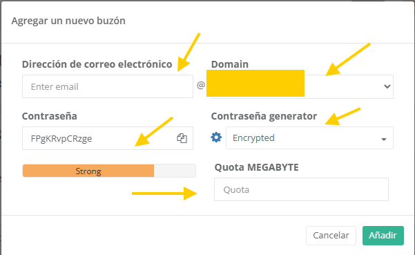 - Escribe el nombre, contraseña y asigna espacio (por ejemplo, 1GB).